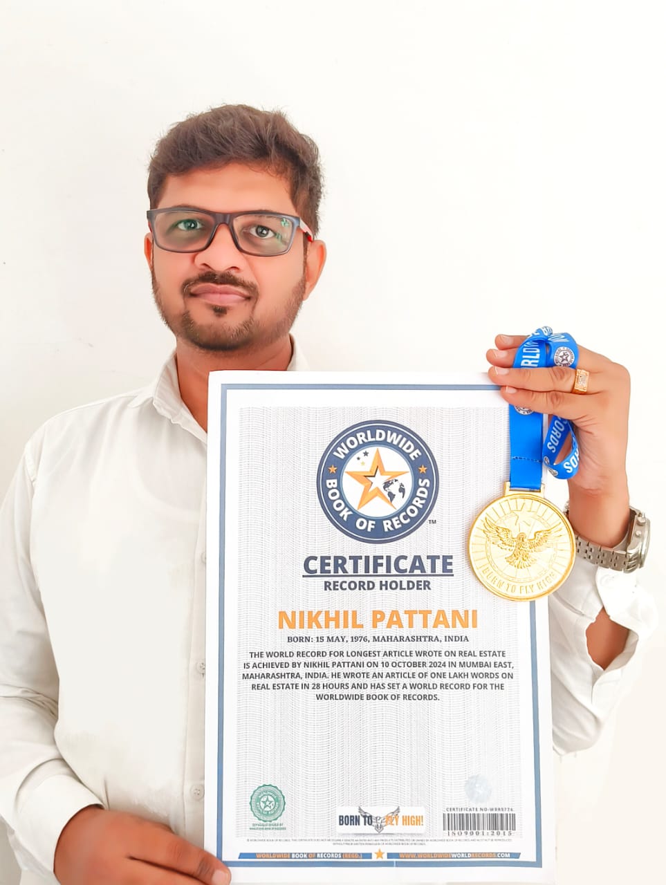 Mumbai – Real estate has always demanded precision and patience, but Nikhil Pattani has redefined the boundaries of the field. In an extraordinary display of dedication and expertise, Pattani has set a world record for authoring the longest real estate article, a groundbreaking 1,00,000-word masterpiece, in just 28 hours—earning recognition from the Worldwide Book of Records.