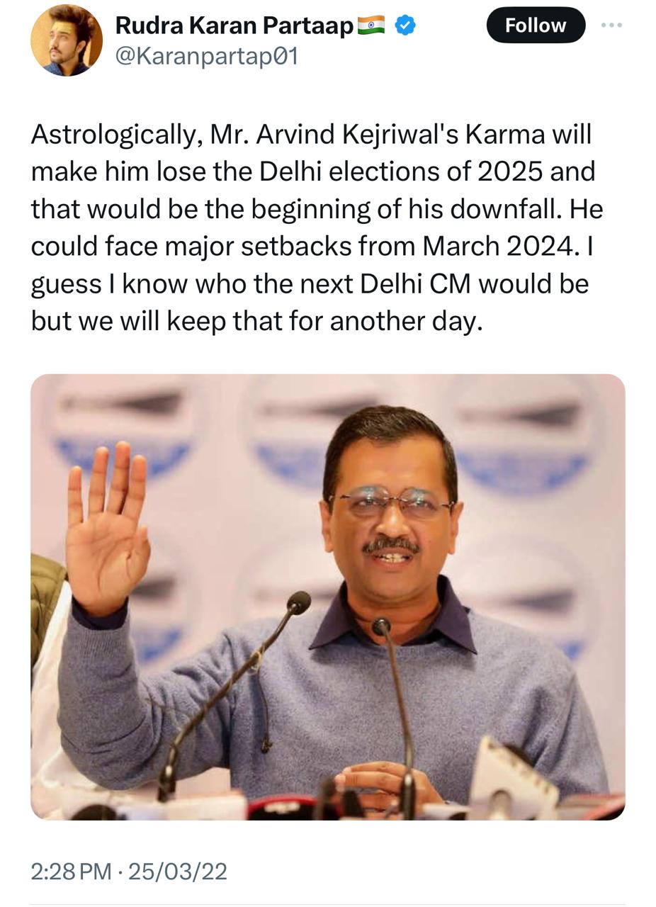 Among Rudra’s myriad astrology predictions are world events, geopolitical shifts, wars, and political outcomes, including those of prominent figures like Arvind Kejriwal, Narendra Modi, Amit Shah, and Imran Khan. Notably, he accurately foresaw the Ukraine-Russia War, specifying the exact date, and predicted the downfall and subsequent arrest of Arvind Kejriwal in March 2022. His foresight extended to electoral results, accurately forecasting the outcomes of the 2023 Karnataka and 2022 Uttar Pradesh Assembly elections.