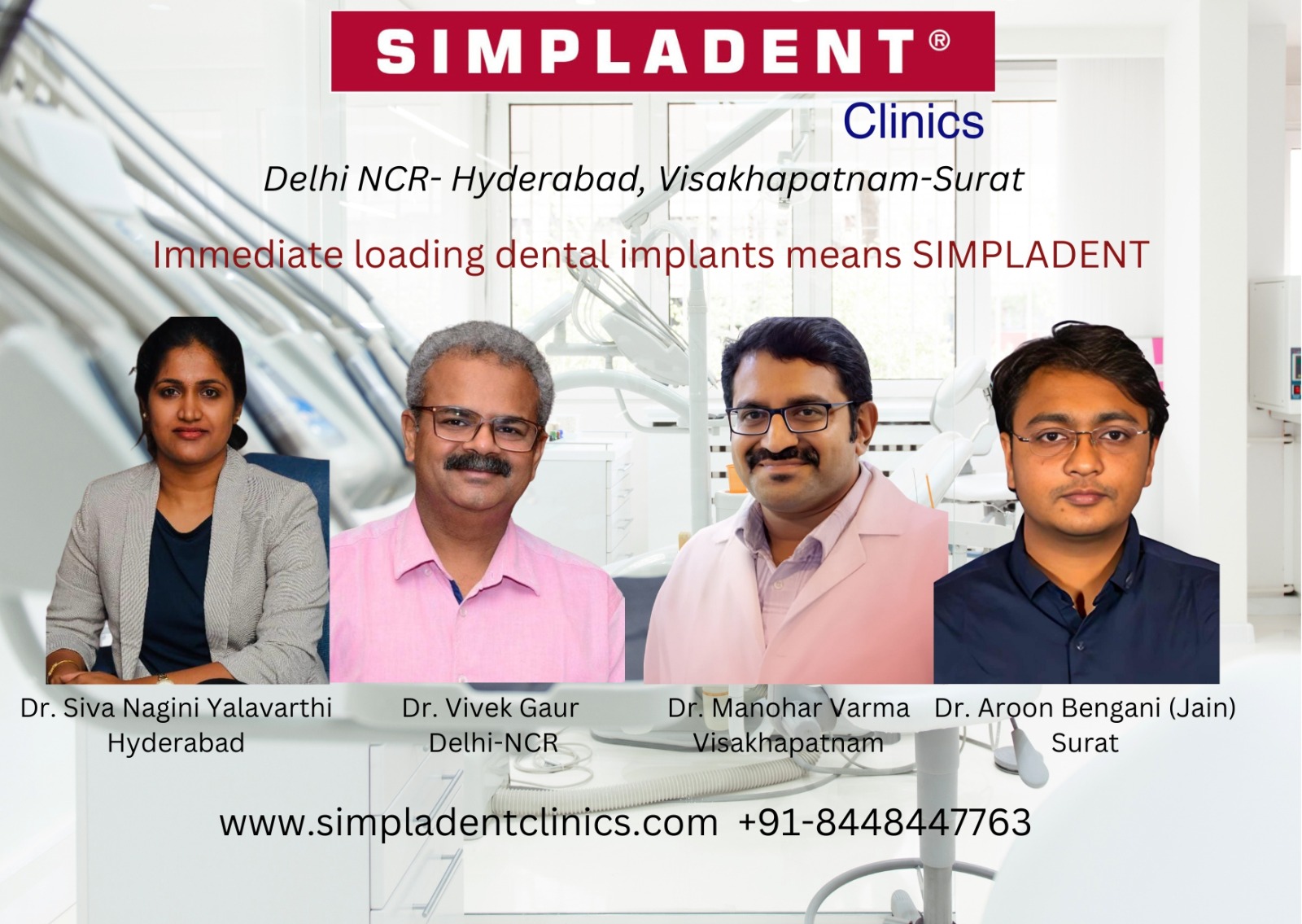 At Simpladent, we understand the profound impact that dental health has on overall well-being. Driven by a vision to provide world-class treatment accessible to all, our esteemed team of experts, led by Dr. Vivek Gaur in Delhi-NCR, Dr. Siva Nagini Yalavarthi in Hyderabad, Dr. Manohar Varma in Visakhapatnam, and Dr. Aroon Bengani (Jain) in Surat, are committed to delivering transformative results with unmatched efficiency.
